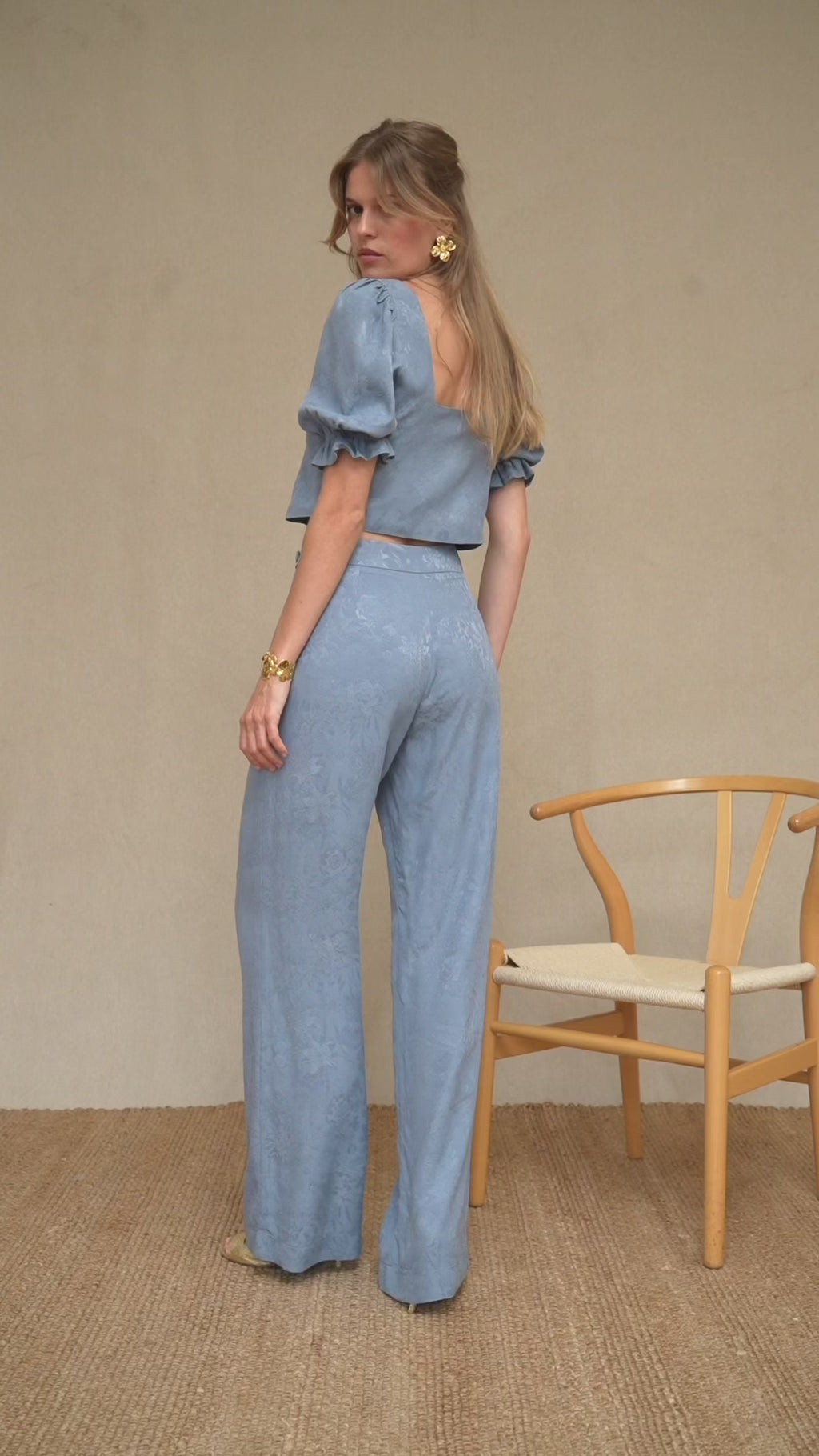 Notre pantalon Augusta, plébiscité pour sa coupe parfaite, est de retour en bleu ardoise. Taille haute, détails couture sur la ceinture, jambe large et fluide. Il se ferme par un zip invisible sur le côté. Il s'associe au top Barbara coordonné pour un ensemble très féminin.