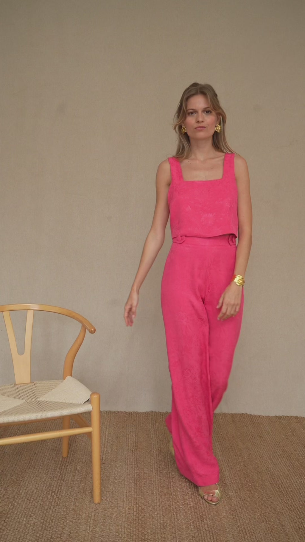 Notre pantalon Augusta, plébiscité pour sa coupe parfaite, est de retour dans un rose bloom rayonnant. Taille haute, détails couture sur la ceinture, jambe large et fluide. Il se ferme par un zip invisible sur le côté. Il s'associe au top Basile coordonné et se portera aussi bien avec un t-shirt rentré à l'intérieur.