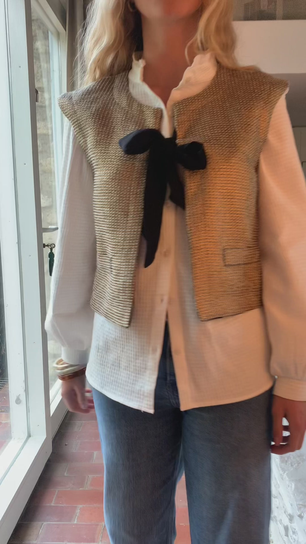 Notre jolie veste Vali se décline dans un un somptueux tweed doré upcyclé issu d’une maison de luxe, cette pièce forte avec son nœud signature se porte aussi bien sur notre chemise Maria blanche que sur une maille épaisse.
