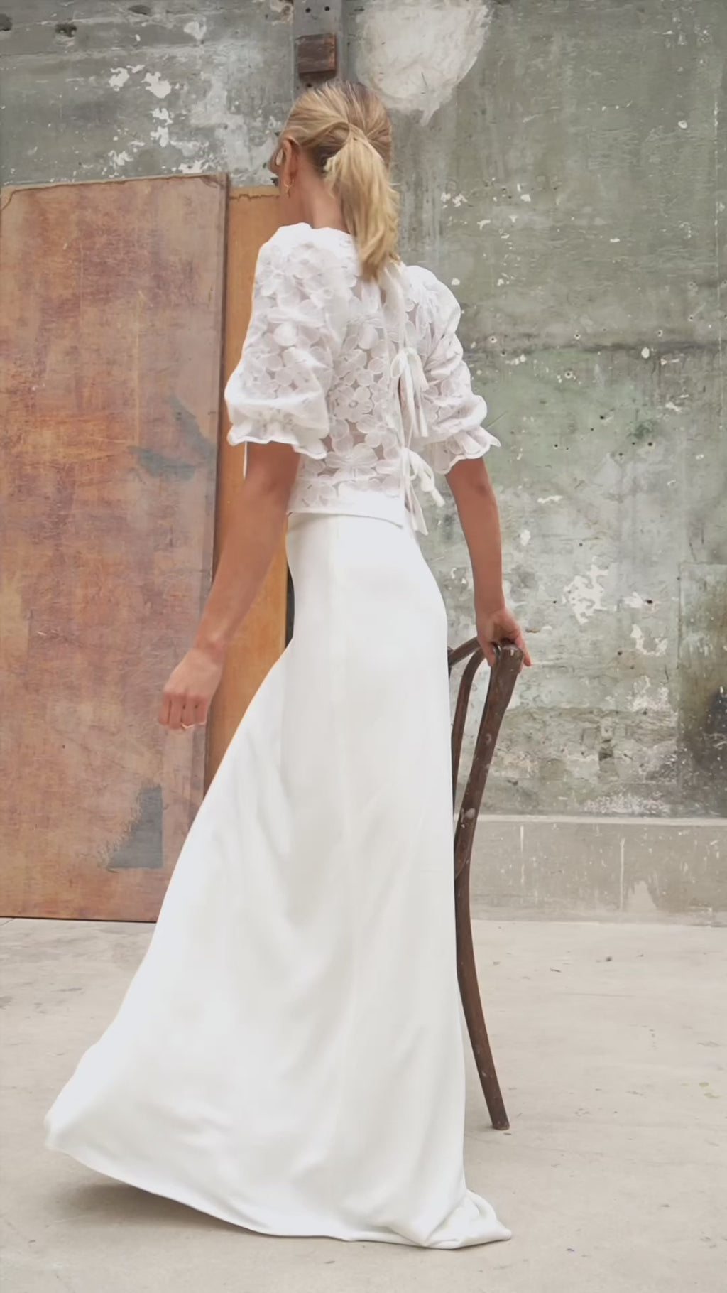 Romantique et tellement féminin, le top Aimé séduit par sa dentelle, ses manches ballons et ses noeuds délicats dans le dos. Sa coupe droite et courte permet de le porter sur toutes nos jupes ou nos pantalons pour la mariée. Mais on pourra aussi très facilement le porter sur jean au printemps.