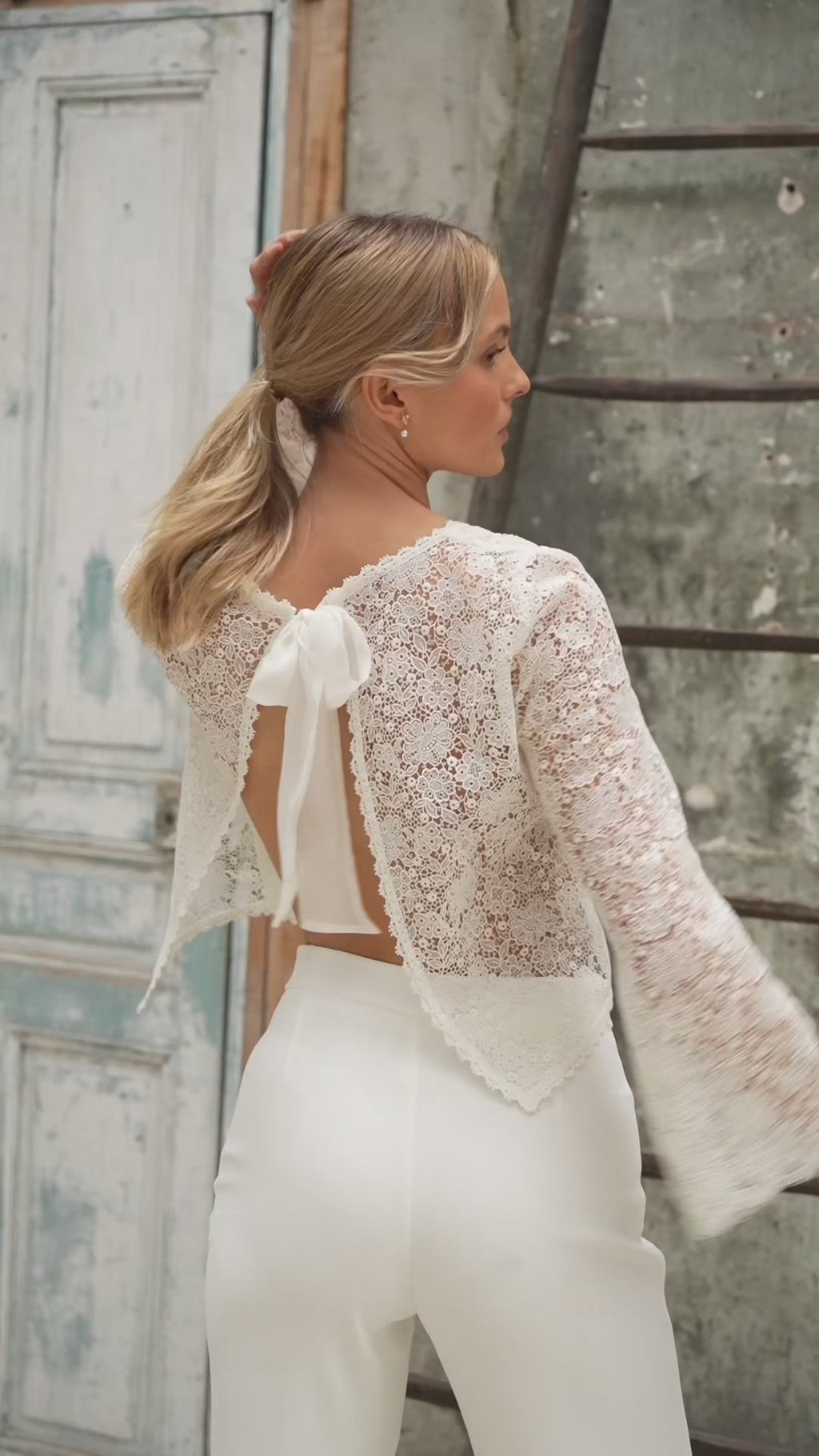 Confectionné dans une dentelle d'exception issue du stock dormant d'une grande maison de luxe. Il est entièrement doublé sur le devant et fermé d'un noeud en soie dans le dos. Ses découpes ont été entièrement bordées d'un galon de dentelle assorti. On aime la transparence maitrisée et les sublimes manches de cette pièce très couture ! Il s'associe à notre pantalon Auguste pour une silhouette moderne, ou bien à notre jupe longue Etienne pour un allure renversante.