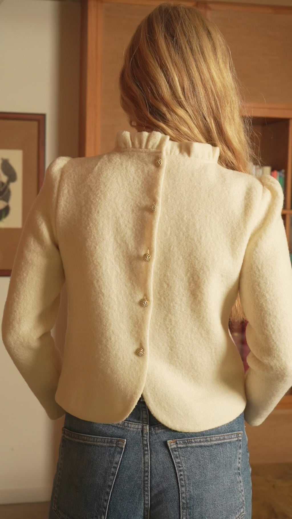 Notre iconique top se décline dans une laine bouillie ultra chic et bien chaude ! Entièrement doublé de coton, il séduit par ses détails et son allure très couture : col froncé, coupe cintrée et courte et un joli dos boutonné. Il est aussi parfait sur un jean que sur un pantalon habillé. Il fera aussi les bonheur des mariées frileuses assorti à notre Jupe Octave.